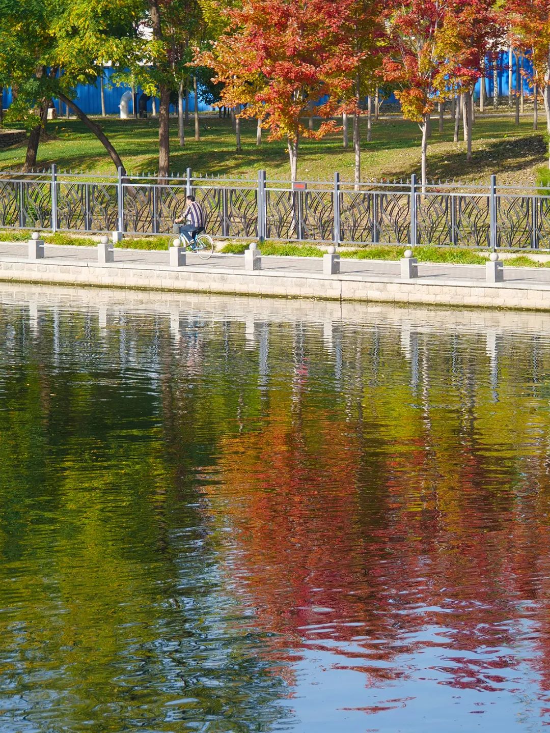 金秋时节,漫步在潮白河畔,首先映入眼帘的便是碧波荡漾的河面。清透的河水沿着蜿蜒的河道缓缓向前,微风拂过,波光粼粼。河道两岸风光秀丽,一步一景,吸引许多市民在这里散步赏景。