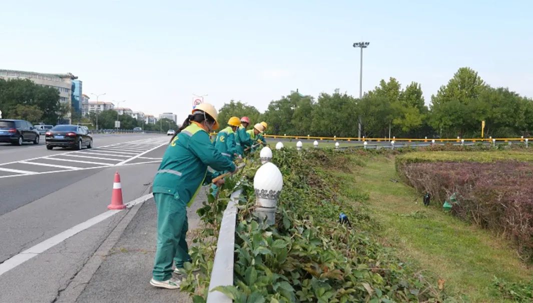 在燕京桥附近,园林工人正在对桥体周围的草坪和绿篱进行日常管理,及时清理绿篱内的杂草,修剪桥梁栏杆处多余乱枝,并对生长过旺的草坪做好日常修剪。同时,及时清理修剪后留下的枯枝、杂草,做到“随剪、随清、随运”,保证路面整洁。