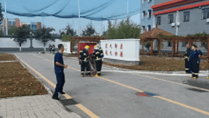 队员协同配合,快速移车,连接消火栓,射水打靶。