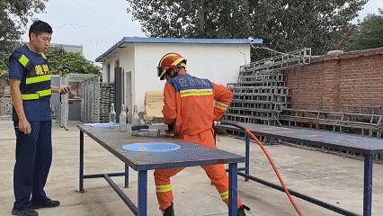穿着全套装备,携带器材利用灭火毯扑灭油桶火,随后,跑至油盘火处,利用灭火器扑灭油盘火。