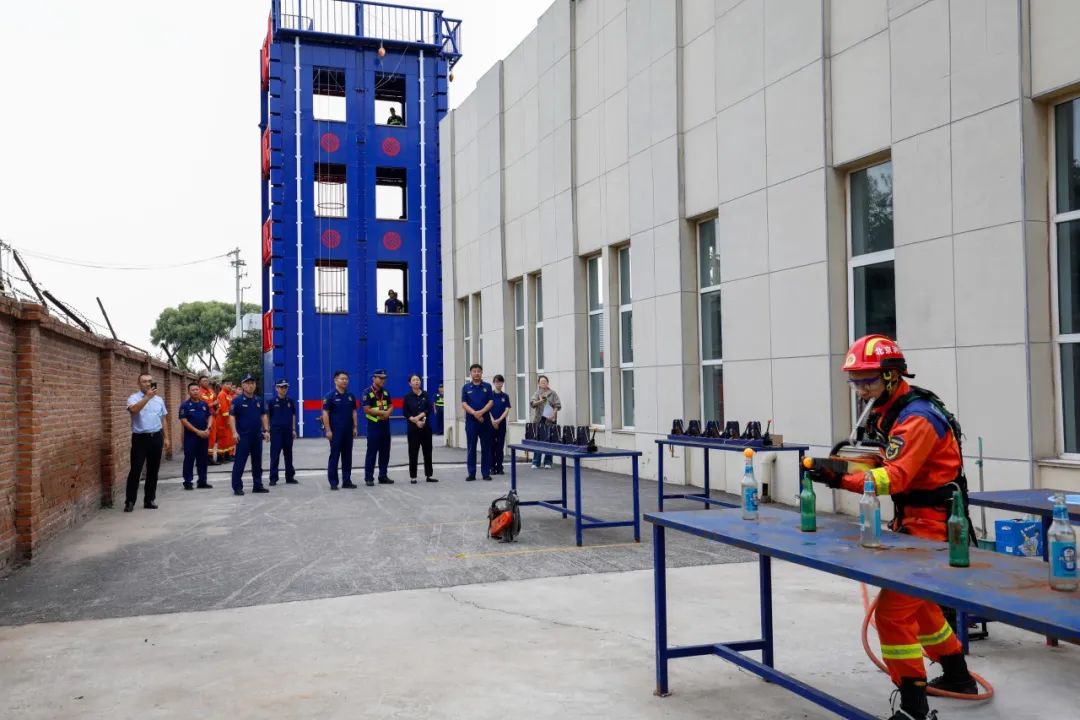 队员们翻腕起梯、挂梯搭脚、登梯、抛梯、越窗,参赛队员们英姿飒爽,动作一气呵成。