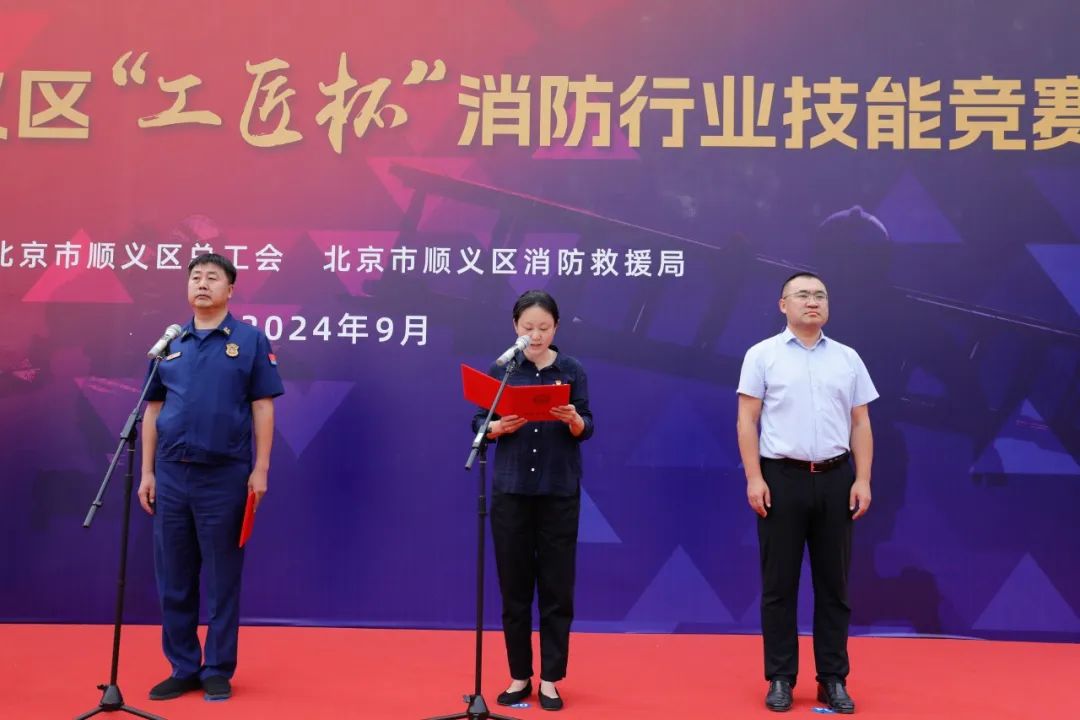 开幕式现场气氛庄重热烈、国歌声嘹亮,顺义区总工会党组成员、副主席姚竞宏做开幕式致辞,区消防救援局政治部金磊主任宣读比赛规则及事项,顺义消防救援队伍、各镇街微型消防站参赛选手以及裁判员代表作宣誓发言,区消防救援局王磊政委讲话并宣布比赛正式开幕。