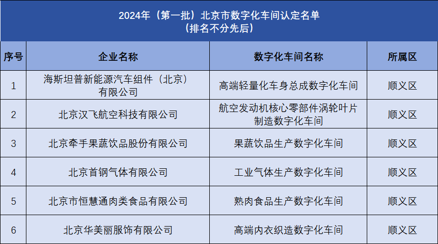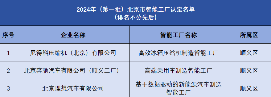 顺义区融媒体中心消息近日,北京市经信局公布了2024年(第一批)北京市智能工厂和数字化车间名单,顺义区9家企业获认定。其中,尼得科压缩机、奔驰顺义工厂、理想汽车获评北京市智能工厂,海斯坦普、汉飞航空等6家企业获评北京市数字化车间,认定数量均位居全市第一。