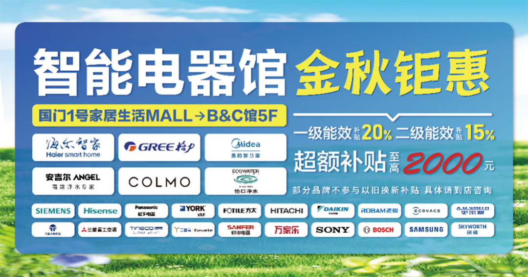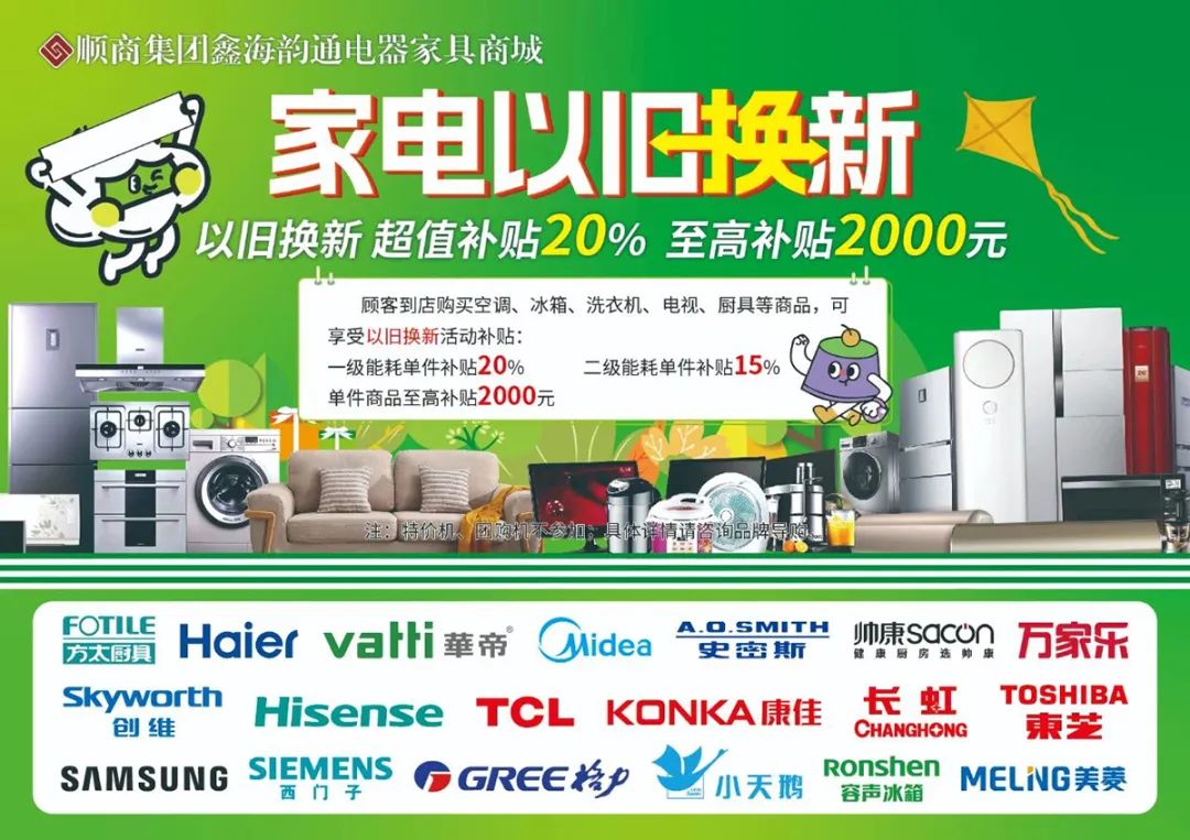 10月1日至7日,鑫海韵通电器家具商城开启“欢度国庆,换新超值购”活动,消费者到店购买空调、冰箱、洗衣机、电视、厨具等商品,可享受以旧换新补贴,一级能耗单件补贴20%,二级能耗单件补贴15%,单价商品至高补贴2000元。