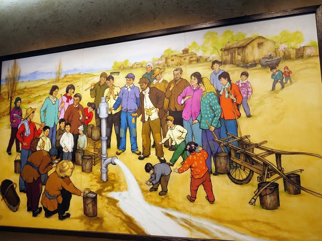 油画展现机井出水场景。