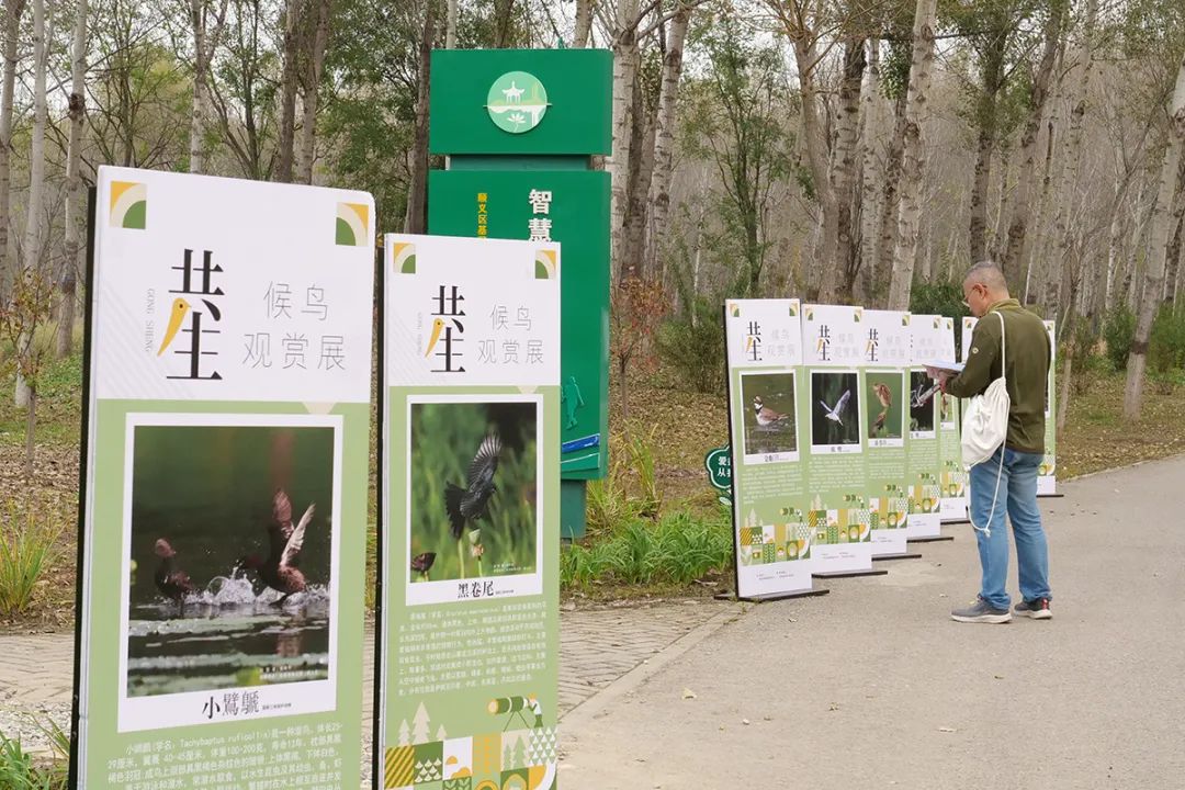 站在观景台上远眺,远处的树林生机勃勃,近处的芦苇随风摇曳。向湖中远望,候鸟翩跹飞舞的身影与秋水相映成趣,构成一幅优美和谐的自然生态画卷。9月29日至10月8日,公园还举办以“共生”为主题的候鸟观赏展,通过科普展览的形式,让游客了解身边鸟类生存状况,提高大家的生态保护意识。