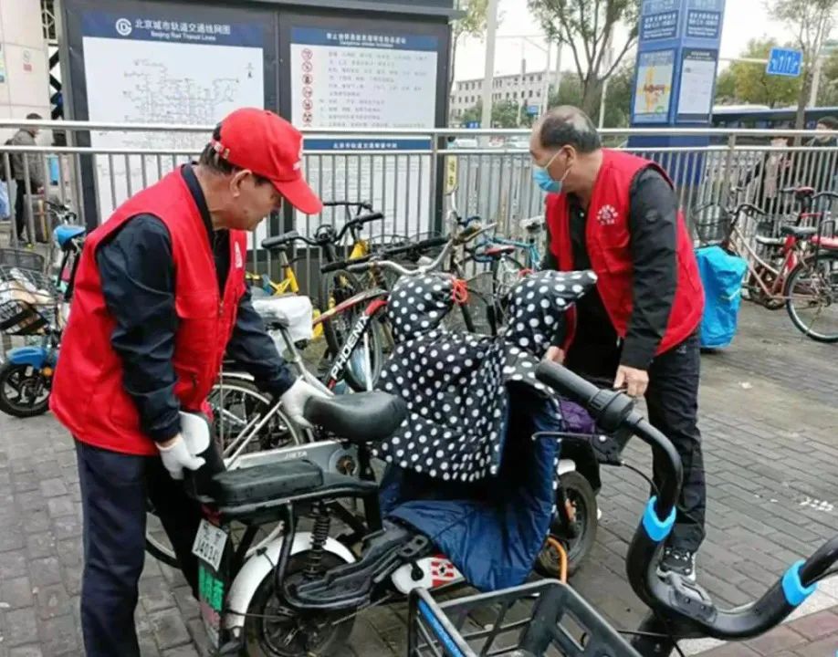戴福成(左一)将地铁站口的电动自行车摆放整齐。(资料图)
