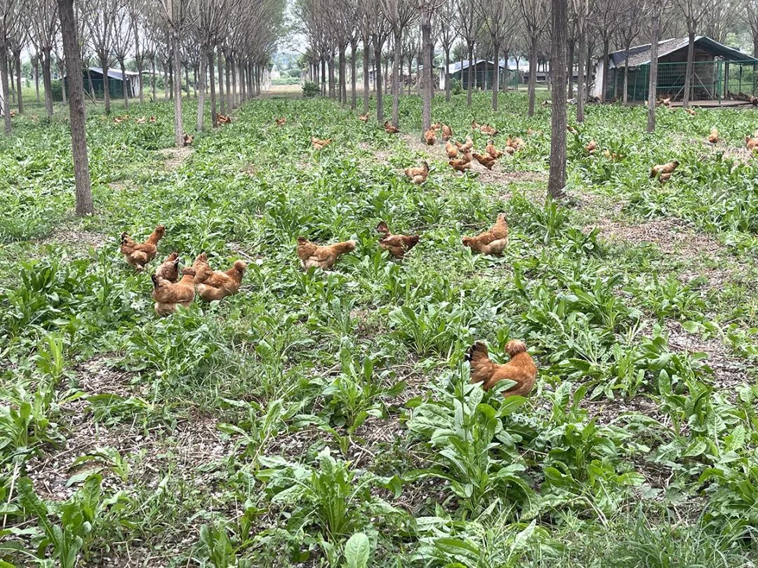张镇的绿嘟嘟农庄位于莲花山脚下,种满菊苣的林地上,北京油鸡在惬意地散步觅食。