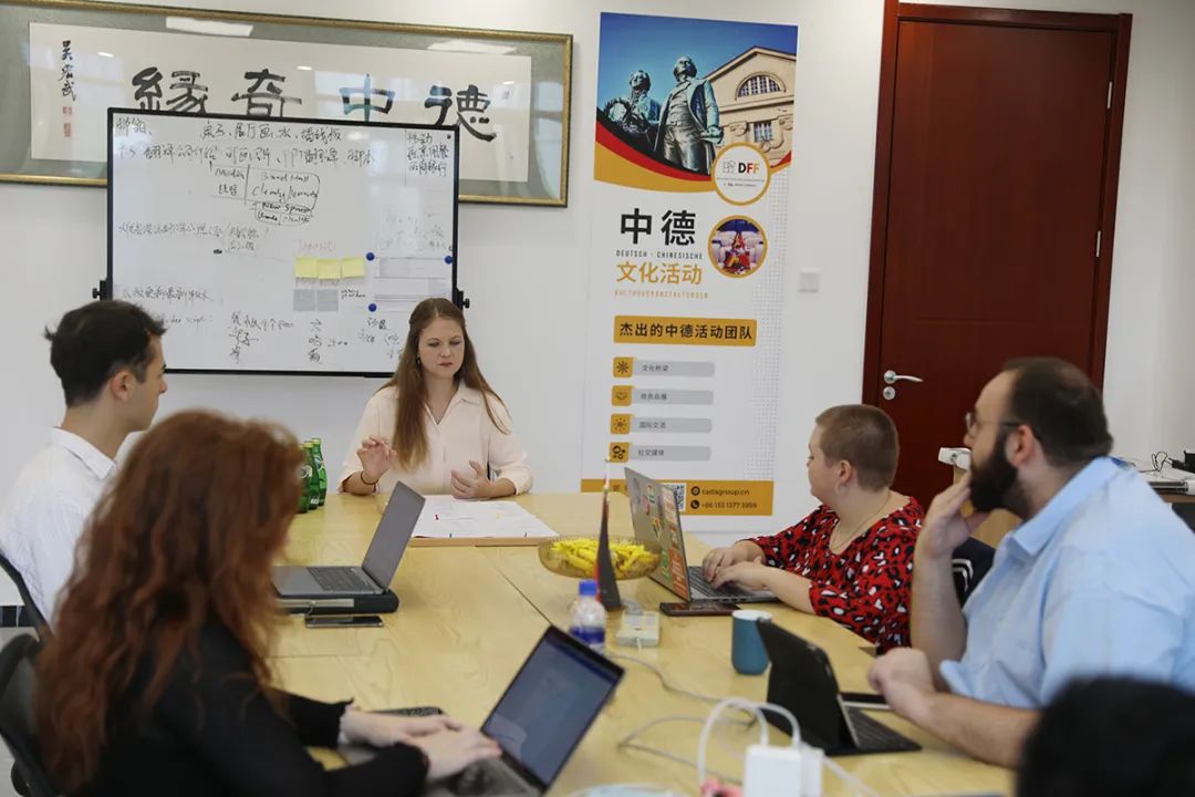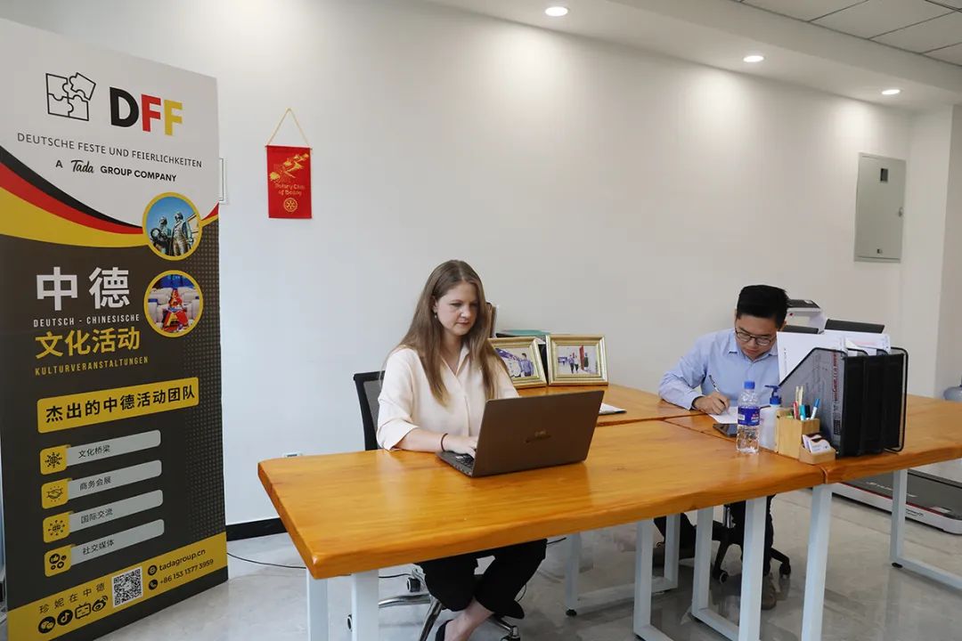 在位于中德产业园的北京塔哒文化科技有限公司内,公司执行董事张珍妮正和同事讨论视频拍摄的脚本。张珍妮来自德国,和丈夫张鼎然组成了中德家庭。2021年,他们定居顺义,创建了北京塔哒文化科技有限公司,将中德优质资源引入中德产业园,打造中德国际文化交流空间。