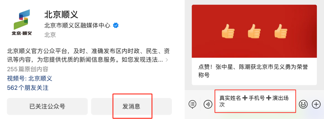 您发送“真实姓名+手机号+演出场次”至“北京顺义”微信公众号,即可参与抢票。