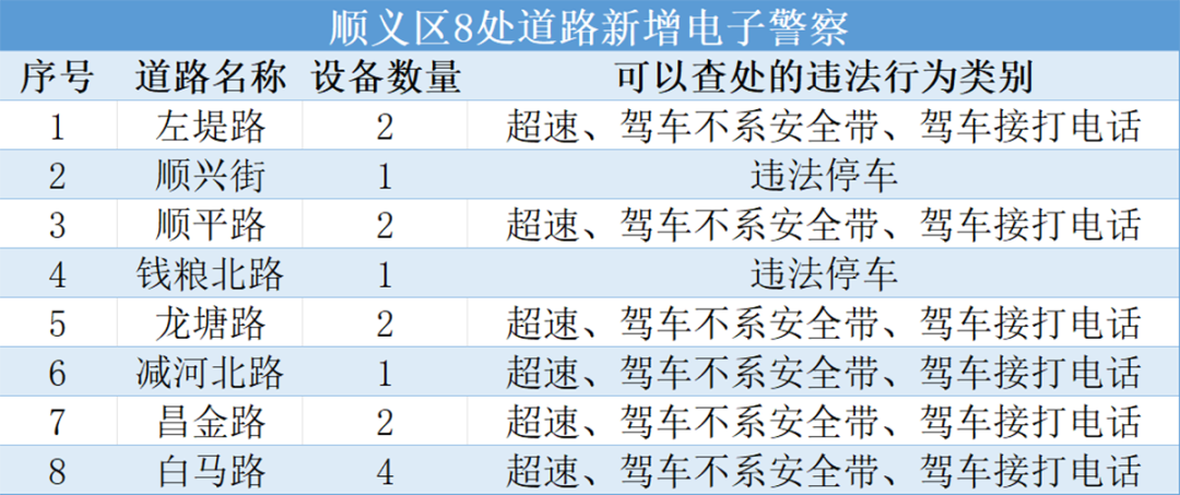 顺义区融媒体中心消息 近日,市公安交管部门发布公告,公布新增的一批固定式交通技术监控设备。其中,顺义区左堤路、顺兴街、顺平路等8处道路新增15个电子警察,重点监测超速、驾车不系安全带、驾车接打电话、违法停车等违法行为。