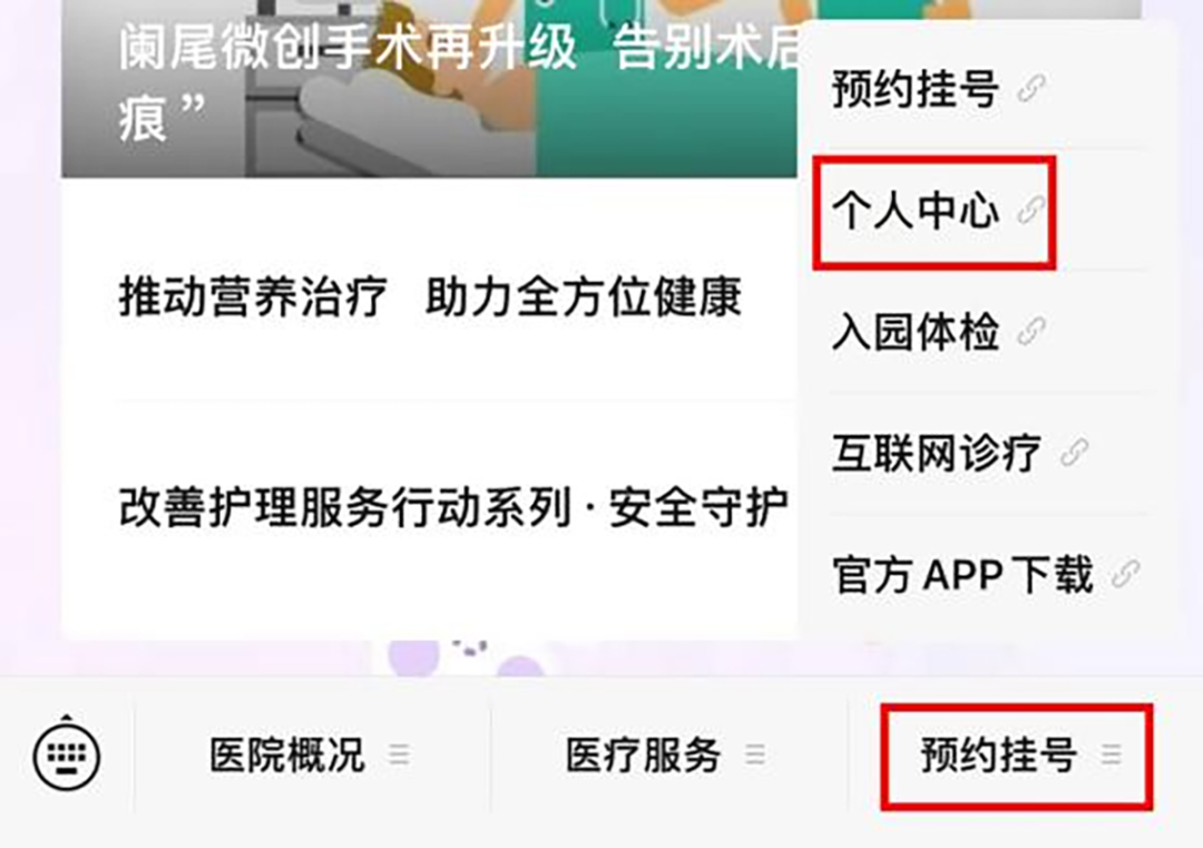 进入北京市顺义区妇幼保健院公众号,点击预约挂号➡个人中心。