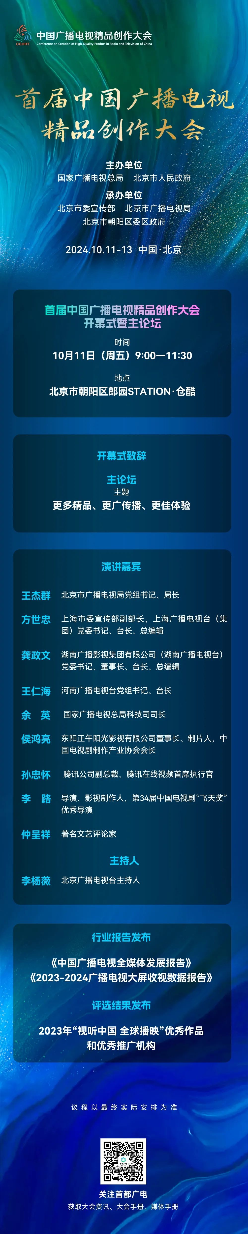 首届中国广播电视精品创作大会将于今天上午在京启幕。大会由国家广电总局、北京市人民政府主办,北京市委宣传部、北京市广电局、北京市朝阳区委区政府承办。大会开幕式暨主论坛即将开启,精彩议程先睹为快!