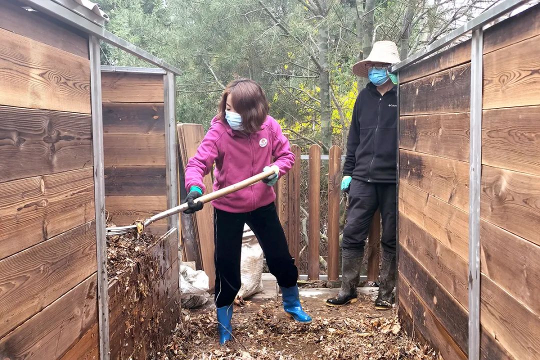 堆肥箱里大有乾坤。“我们采取的是‘三明治堆法’,一层落叶加一层厨余垃圾再覆盖一层落叶,堆肥过程中要定时测量温度和高度,还要定期‘翻肥’。约3个月,这些材料就会转化为有机肥料。”亓伟伟说。