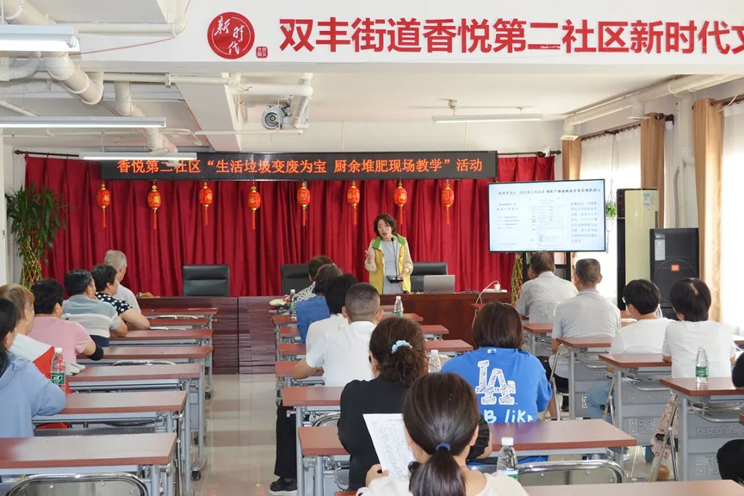 亓伟伟(右一)向居民讲解家庭厨余堆肥方法。