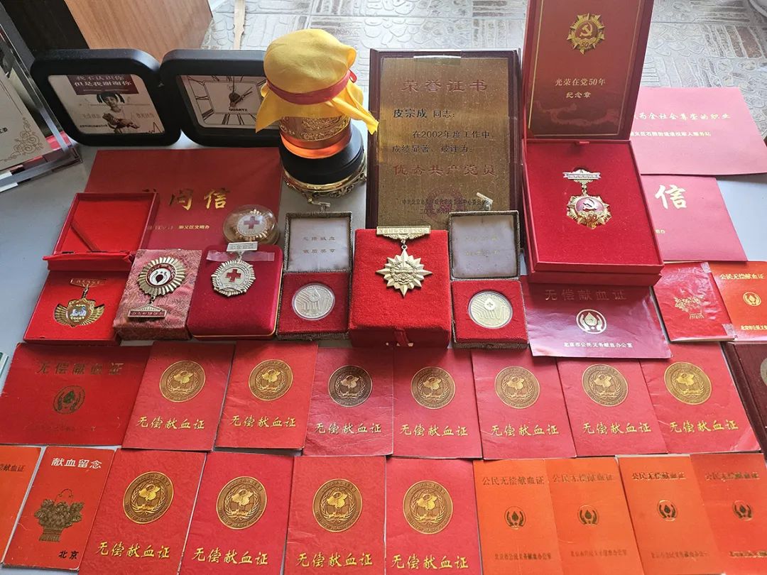 1987年至1992年获顺义区无偿献血状元、1987年至1992年获无偿献血银质奖章、1996年获首都精神文明建设奖章……在皮宗成的家里,层层叠叠的荣誉证书,无声地诉说着他的公益之路。