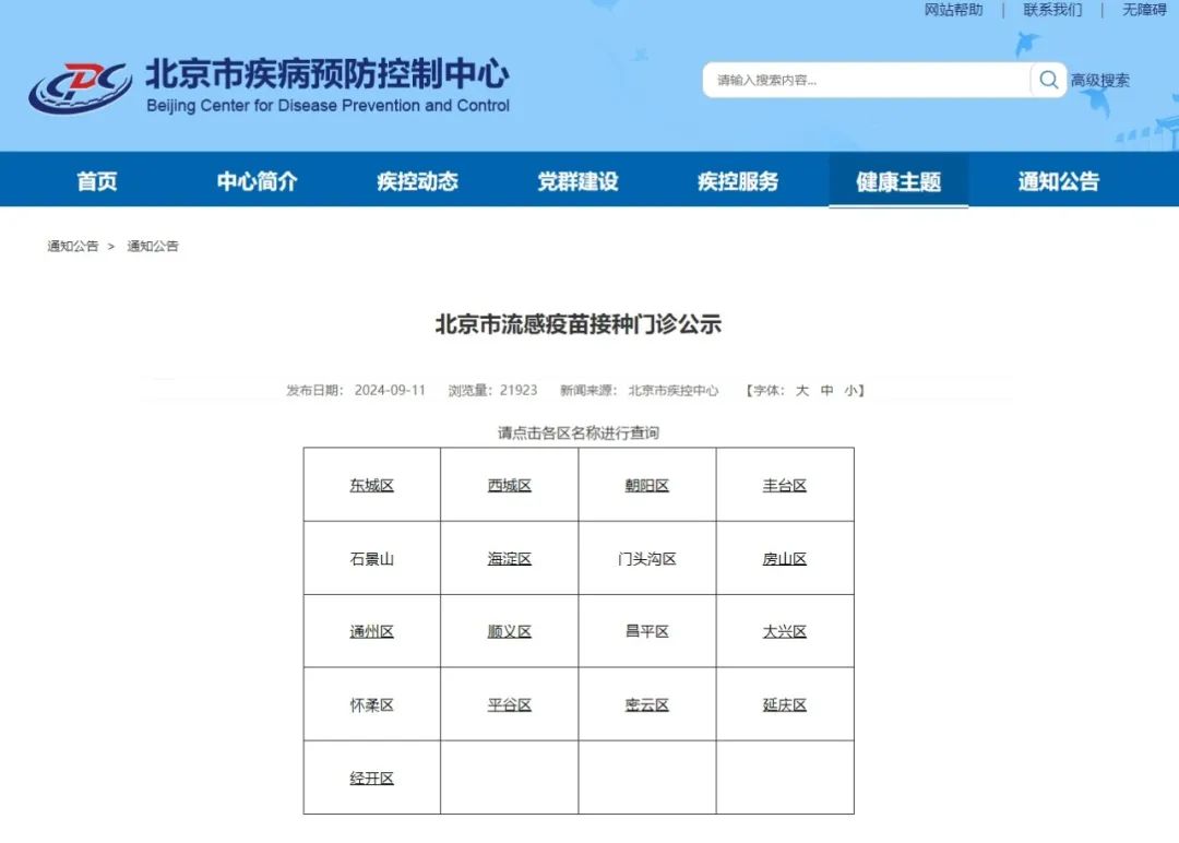 点击文章末尾“阅读原文”,跳转至上图网页(北京市流感疫苗接种门诊公示),查看各区流感疫苗接种门诊详细信息。
