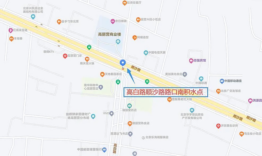 高白路顺沙路路口南积水点位置。