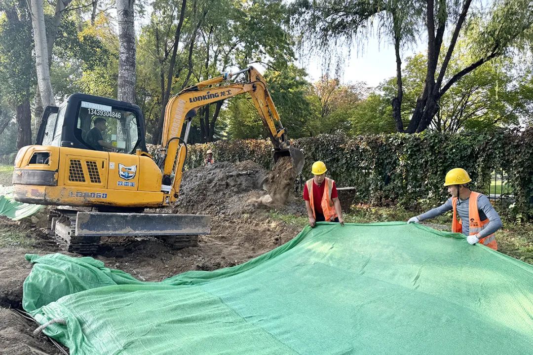 顺平辅线顺义公园段道路地势低洼,公园东门外管涵堵塞,雨量较大时会导致边沟积水排至路面,存在安全隐患。记者来到顺义公园周边路段看到,几名施工人员正配合大型机械改造明沟,并将裸露地块进行苫盖。