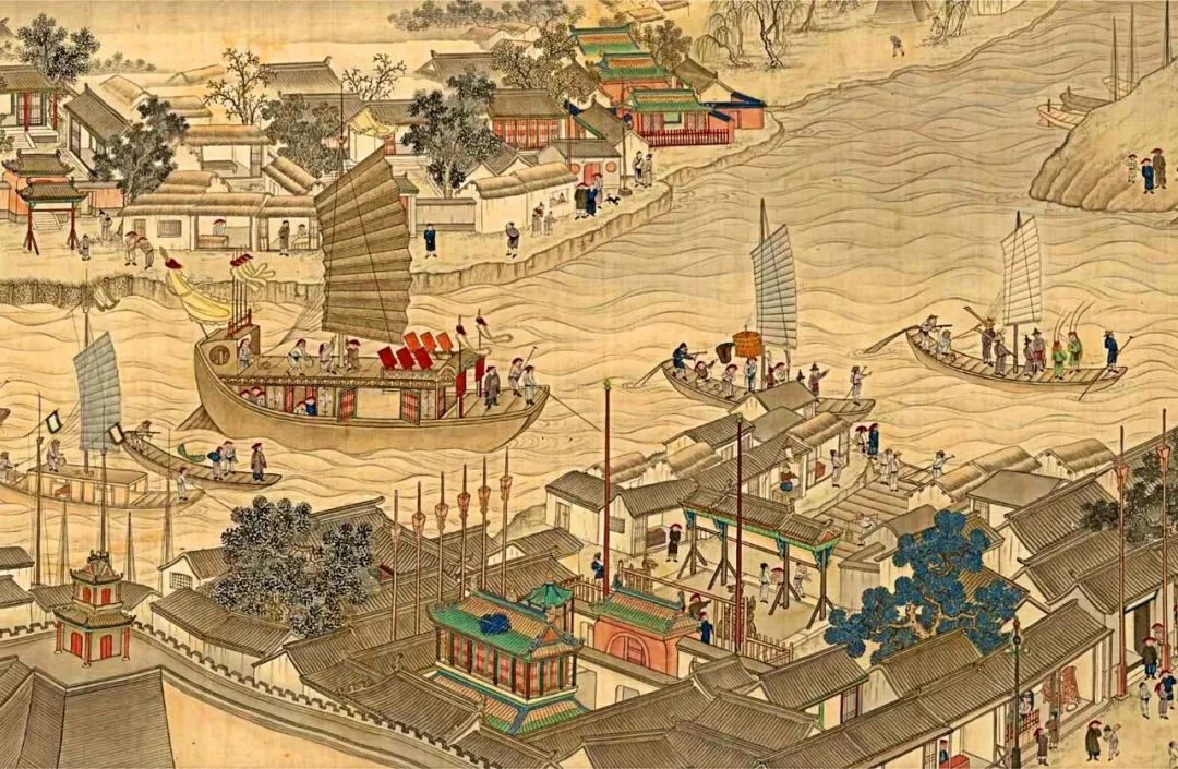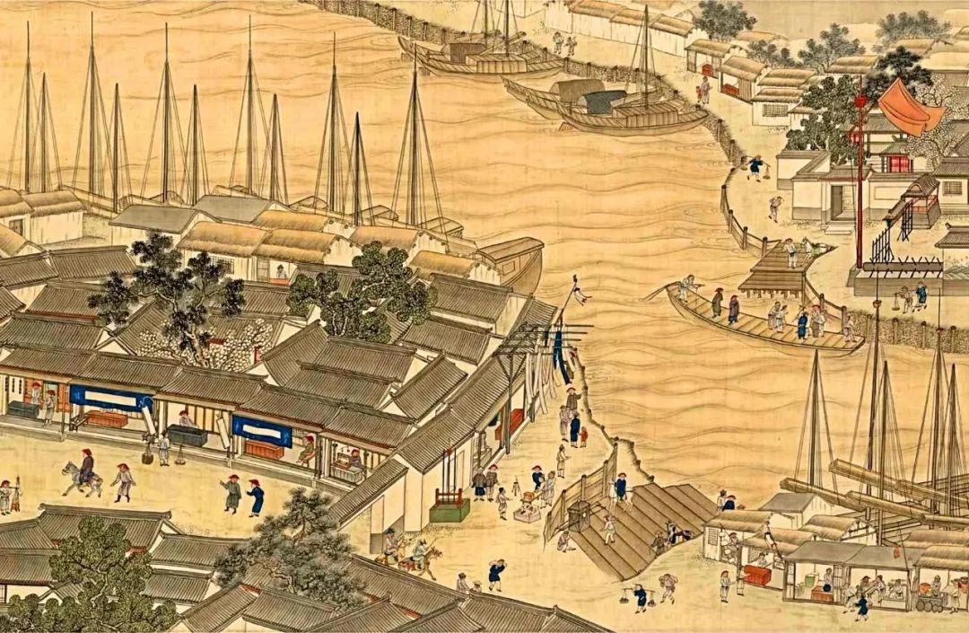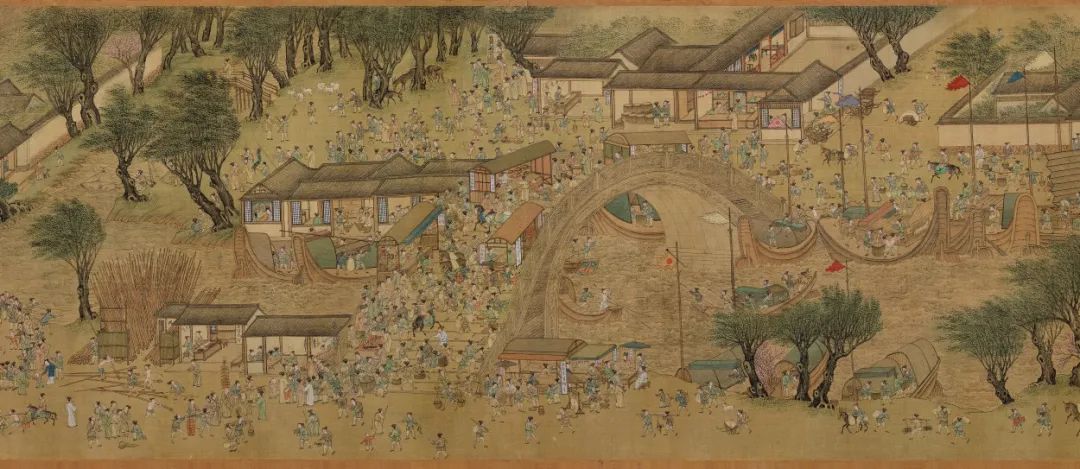 在本次展出的大运河相关书画中,值得注目的是辽宁省博物馆收藏的明代仇英《清明上河图》。此卷《清明上河图》参照了宋代张择端《清明上河图》的构图形式,采用青绿重设色方式,描绘明代苏州城的社会生活情景,画中人物超过两千,且都神态各异,栩栩如生,既是中国古代绘画史上承前启后的风俗巨作,也是研究明代中后期社会生活和文化史的有力图证。