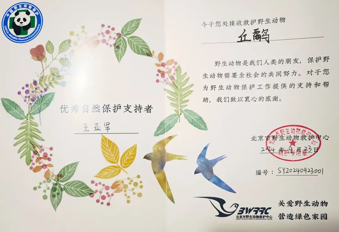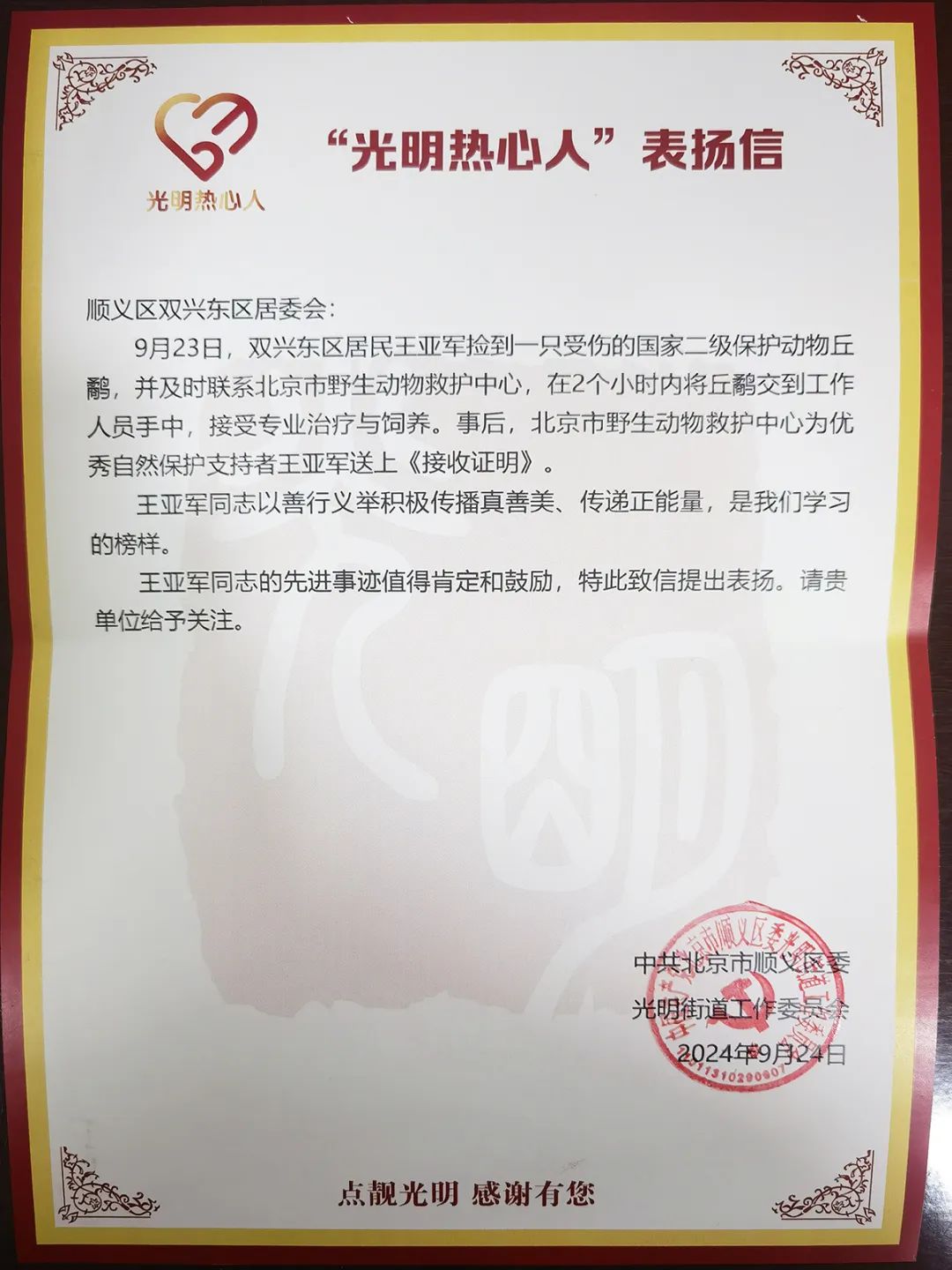 事后,北京市野生动物救护中心为王亚军送来接收证明,鼓励其爱心行为。同时,光明街道也为她送上表扬信,对她的善举表示赞扬。
