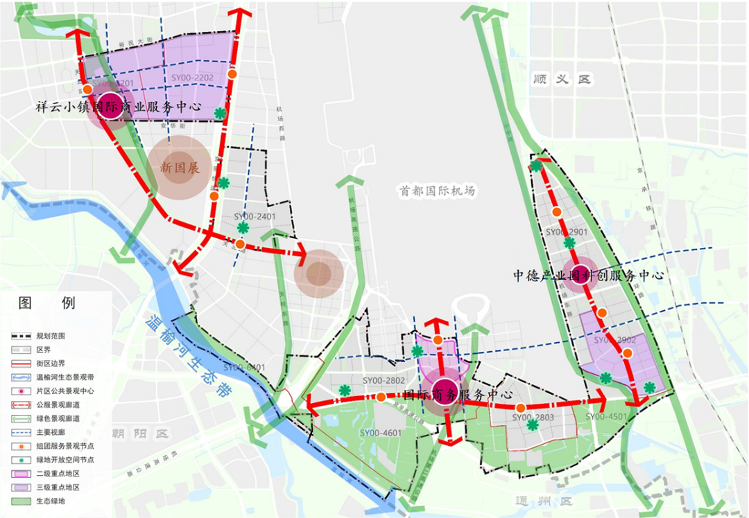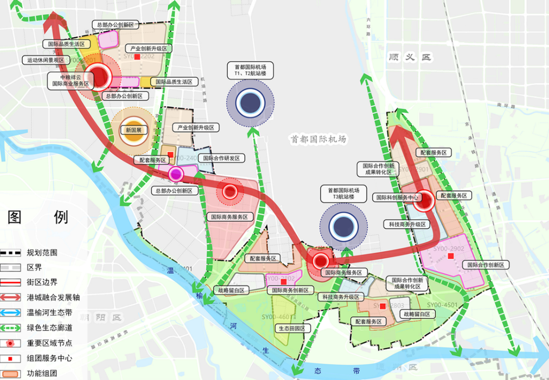 在空间结构上,构建了“一轴、一带、七廊、多节点”的整体空间结构。以天北路-四纬路-鑫桥中路为轴,串联首都机场和临空经济示范区组团各街区,包含温榆河生态带、七条城市高快速路和主干道,多个街区级服务中心节点分布其间。