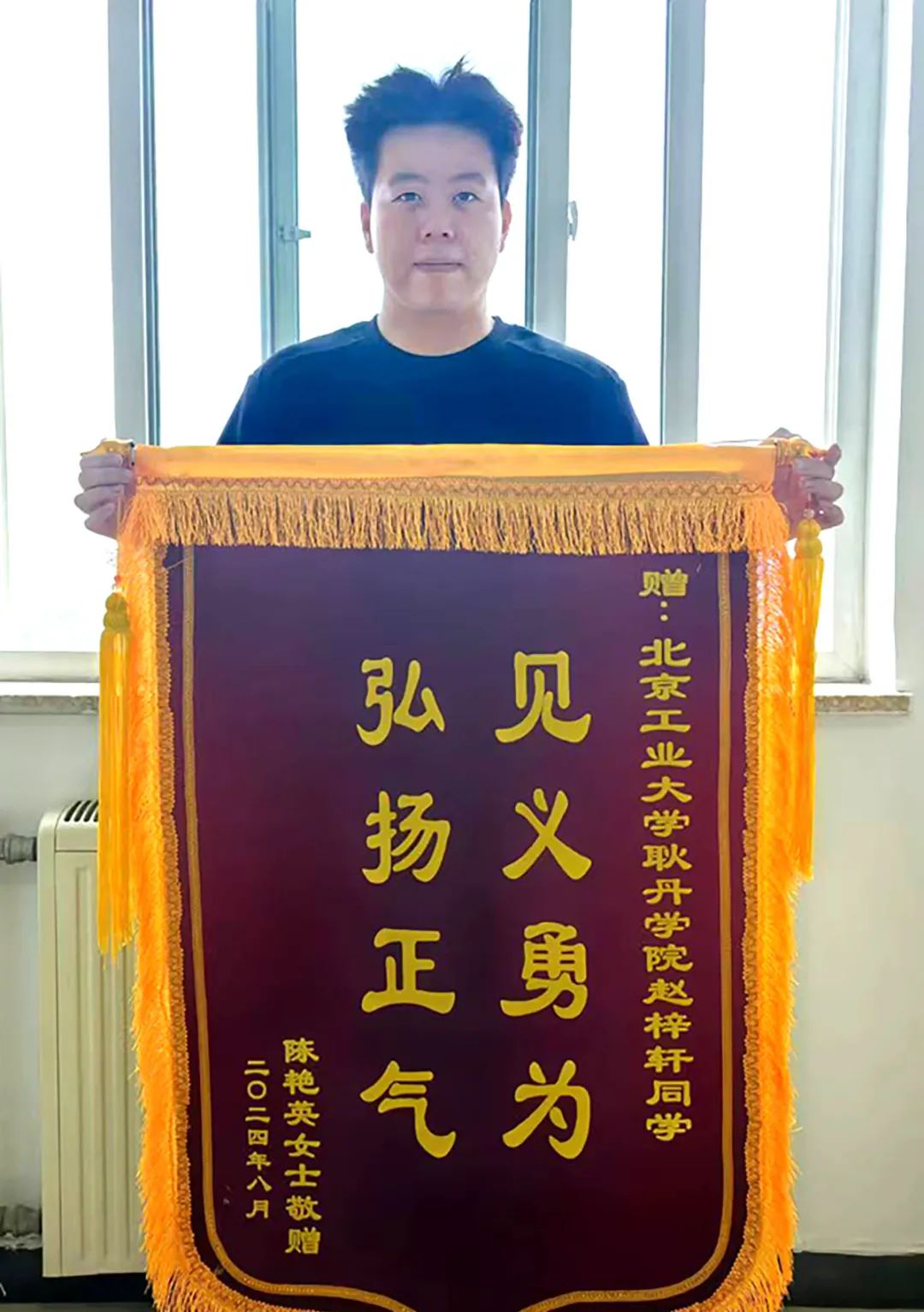 锦旗上书“见义勇为,弘扬正气”