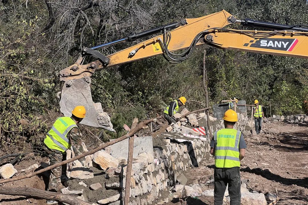 工人在茶棚村峪子沟崩塌隐患点修建导流堤。