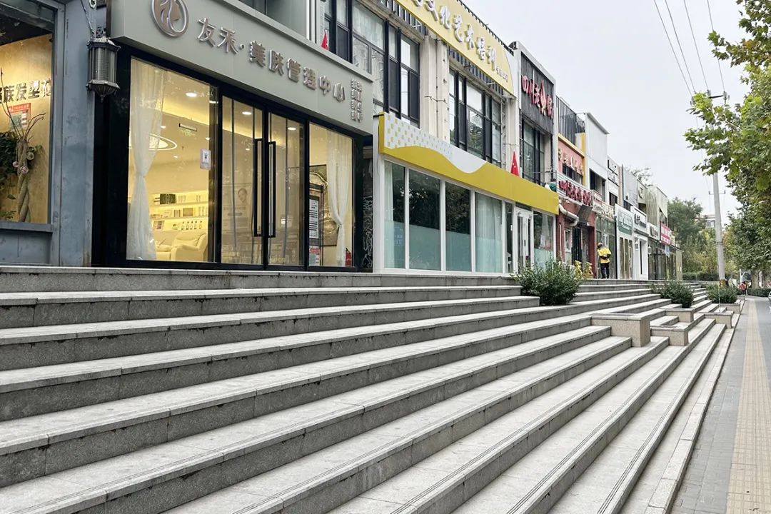 香悦四季社区商业街新铺设的台阶砖和新施划的停车位。