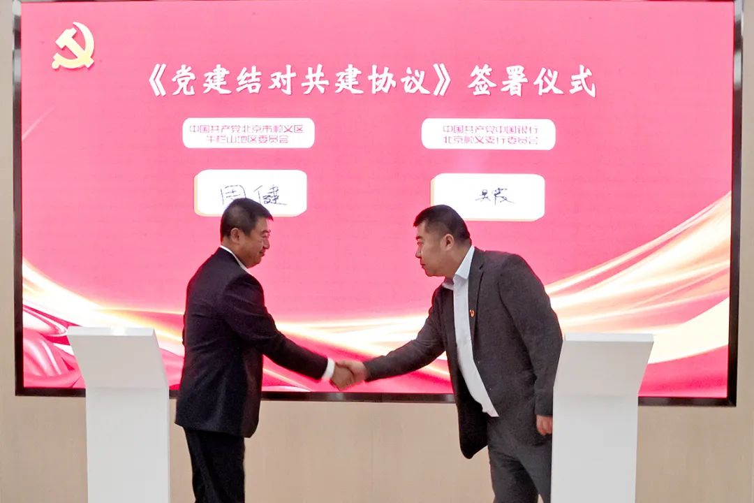 活动现场举行了党建共建合作签约仪式。牛栏山地区党委与中国银行顺义支行党委将依托“村企园”党建共建机制,开启银政合作新篇章,利用中国银行的平台宣传和推广“牛栏山”品牌,为牛栏山镇的招商引资注入客户、金融以及资金资源,进一步创新工作举措、激发党员队伍活力,服务区域企业,推动地区经济发展。