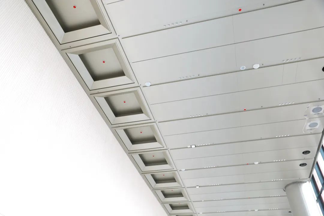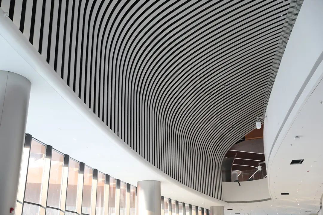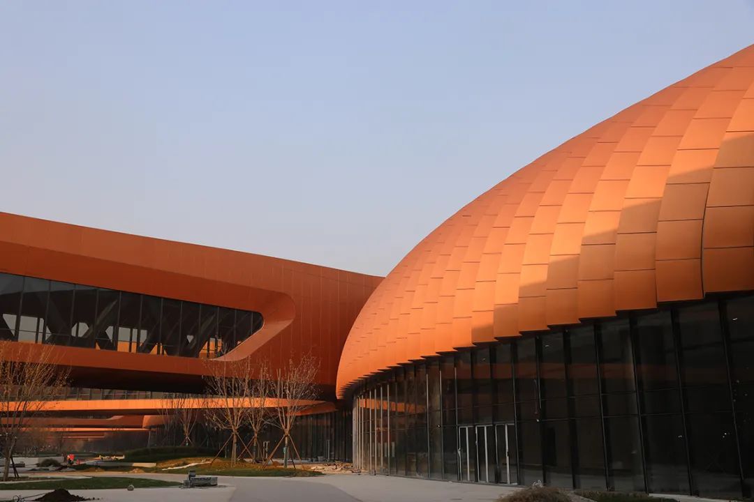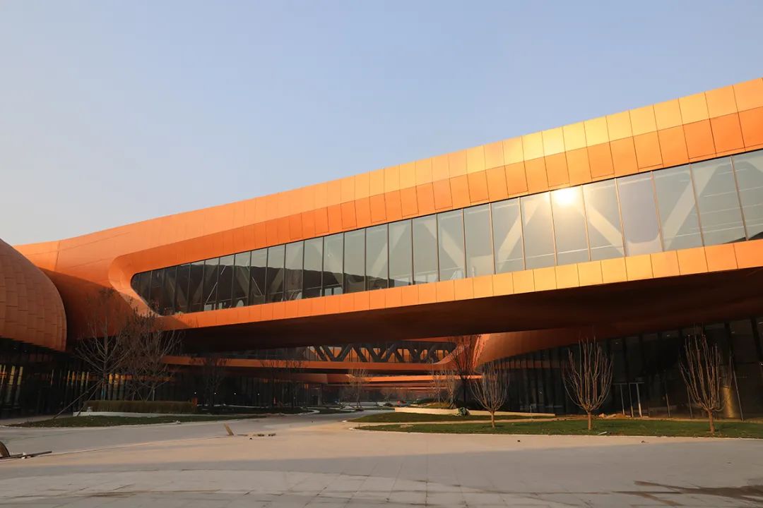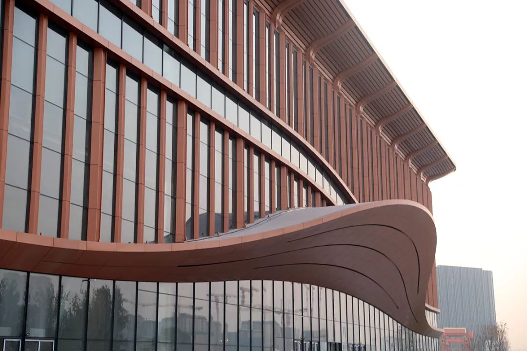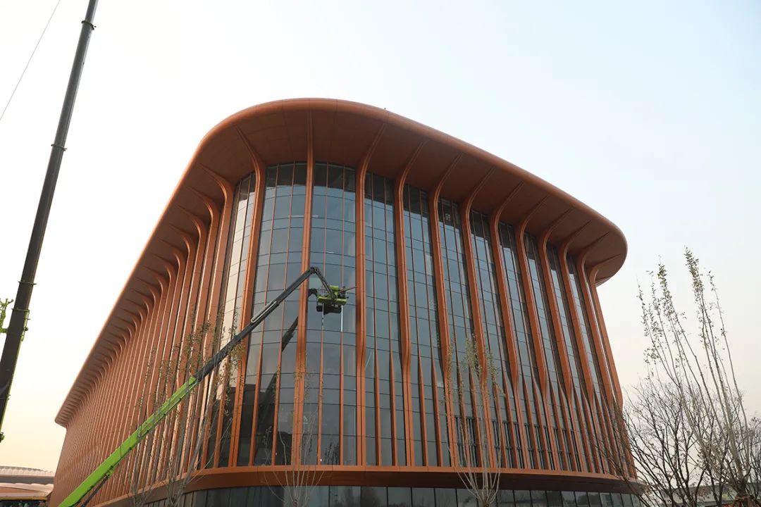 走进新国展二期项目,大量的双曲铝板组成了如丝带般轻盈灵动的幕墙,流线起伏的建筑外观让庞大的建筑体别具一格。
