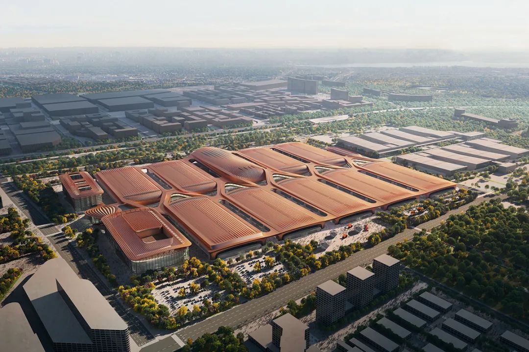 新国展二期包括1栋会议中心、1栋酒店和展览中心,其中展览中心包括9栋展馆和3栋登录厅,各场馆之间通过丝带状连廊相连,连廊下的中央绿轴正在进行绿化工程,届时将为观众提供休憩、打卡之地。