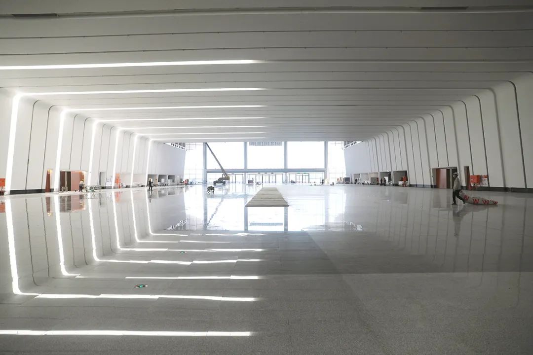 作为新国展二期的主要出入口,东登录厅跨度超百米,室内空间大、通透感强,灯带设计营造出精致大气的视觉效果,目前工作人员正在进行地面清洁等工作。“展览中心以‘紫金交织,光辉纵横’为设计理念,利用横向线性的重复,纵向线性的延伸,形成强烈的秩序感与延伸感。”北京辰星国际会展有限公司总经理助理张利东介绍。每个展馆的面积约2.2万平方米,相当于2.9个标准足球场面积,当观众走进任何一栋展馆或登录厅,视觉冲击和空间力量感都会扑面而来。