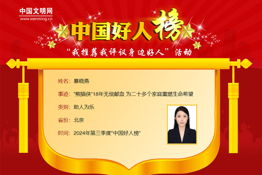 顺义区融媒体中心消息好人就在身边,善行来自日常。11月12日,中央精神文明建设办公室发布2024年第三季度“中国好人榜”,顺义区暴晓燕入选助人为乐类“中国好人榜”。
