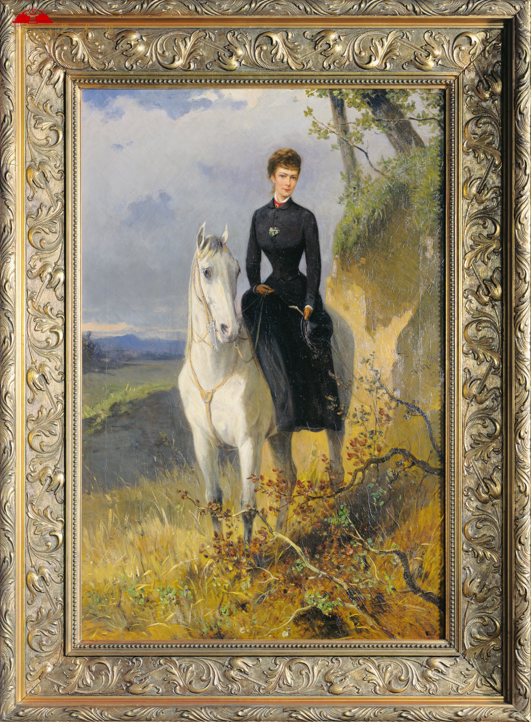 在这次展览中,将展出著名艺术家威廉·里希特1877年创作的油画《马背上的伊丽莎白王后》。画中,茜茜公主身着黑色骑装,骑在一匹白马上,身形挺拔,身后是旷野与蓝天,这正是她所钟情的驰骋人生。