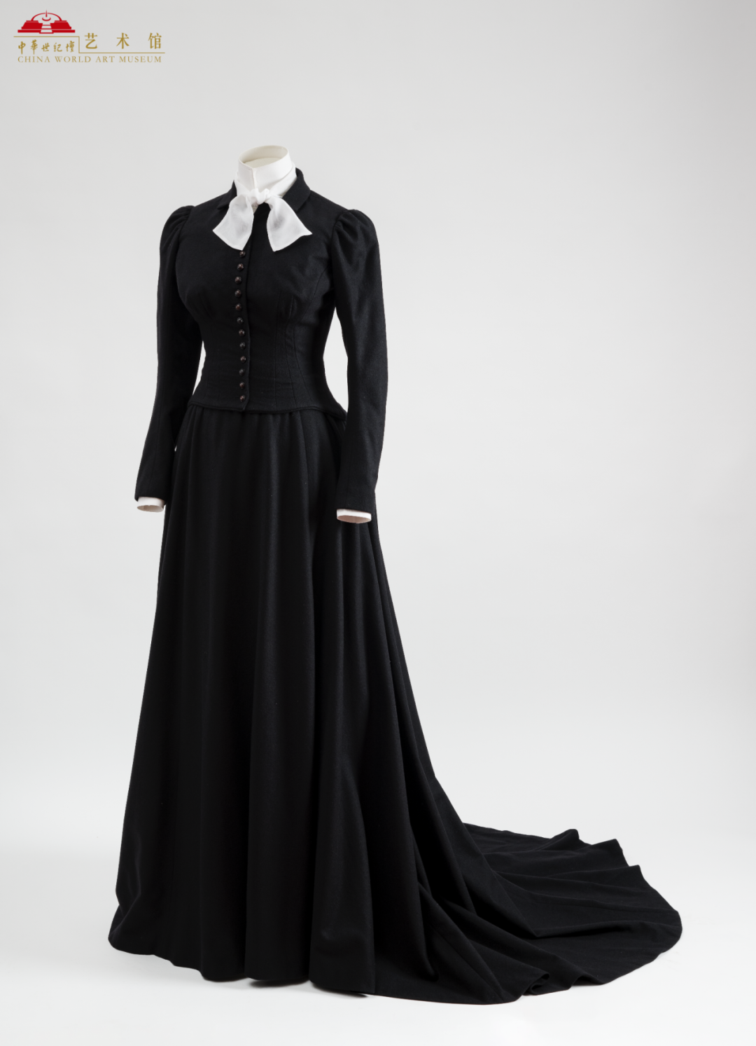 此外,一件《伊丽莎白王后骑行服改制》展品也将在展览中亮相。这件骑马服为茜茜公主量身定制,黑色的紧身大衣搭配外露蕾丝的领口上衣,配上飘逸的长裙,典雅又富有力量。1889年,她的儿子鲁道夫去世后,她便终生身穿黑衣,以此表达深沉的哀思。