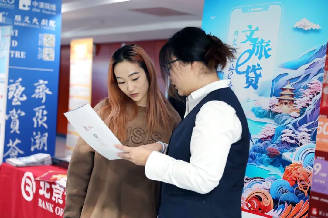 在现场开设的文旅市集上,区内16家特色文旅企业、金融机构等开展宣传推介,优质的文旅资源项目、适企的银行政策吸引不少意向企业负责人驻足交流。