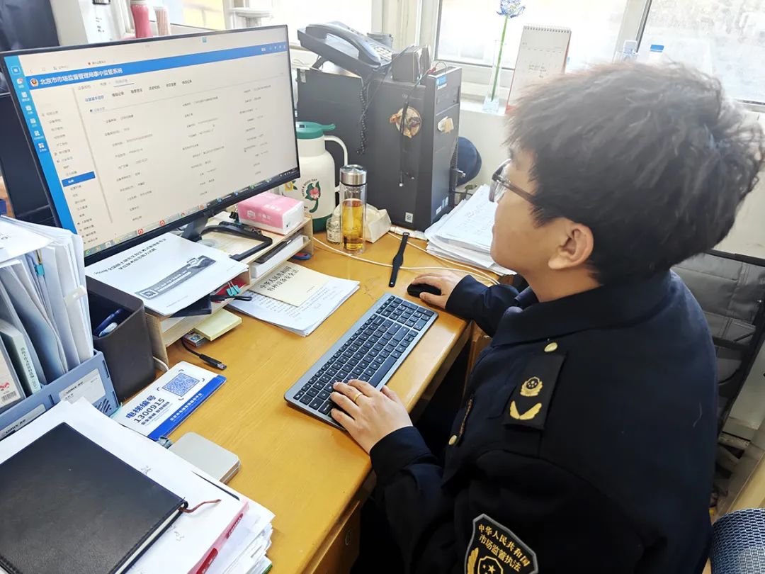 区市场监管局执法人员通过后台查看“一梯一码”情况。