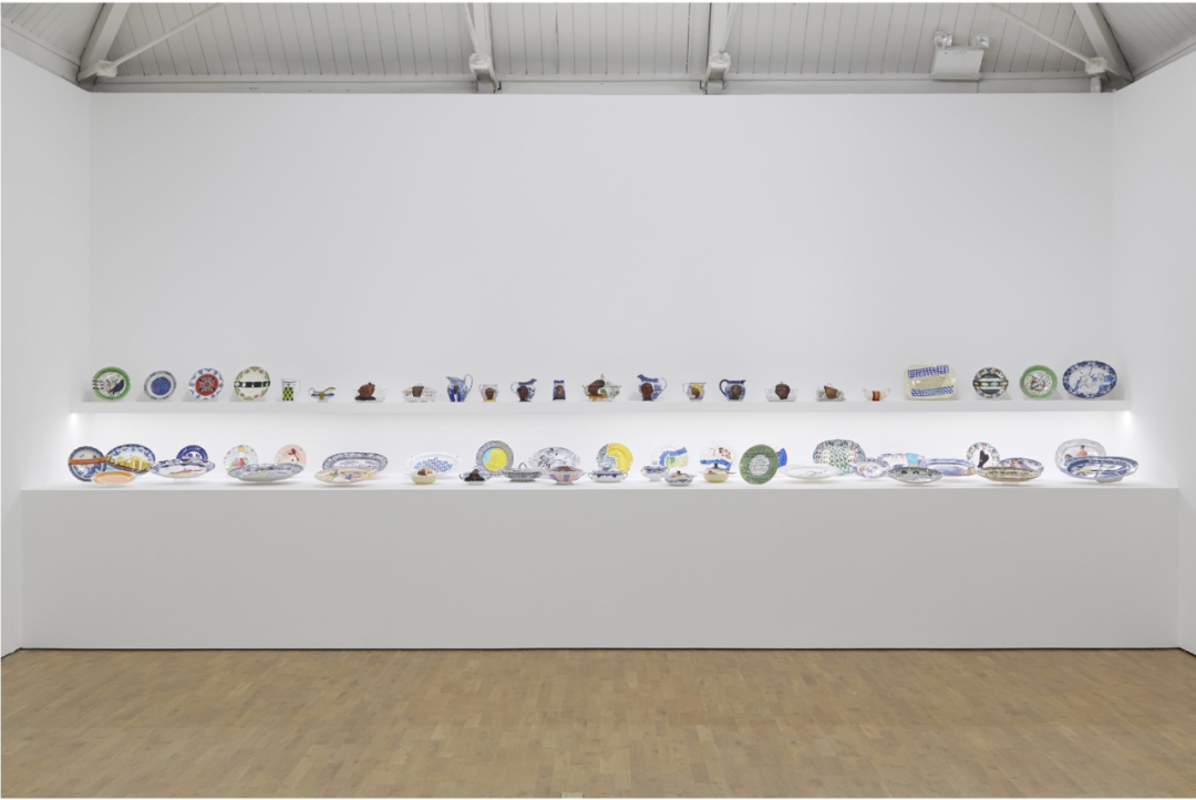 卢贝娜·希米德,《难以下咽:兰卡斯特晚宴服务》,2007,旧陶瓷上丙烯,尺寸可变。由艺术家、伦敦Hollybush Gardens画廊和纽约格林·纳夫塔利画廊提供。“隐形策略”展览现场图,牛津现代艺术中心,2017。©卢贝娜·希米德。图片由牛津现代艺术中心提供,摄影:本·韦斯特比。