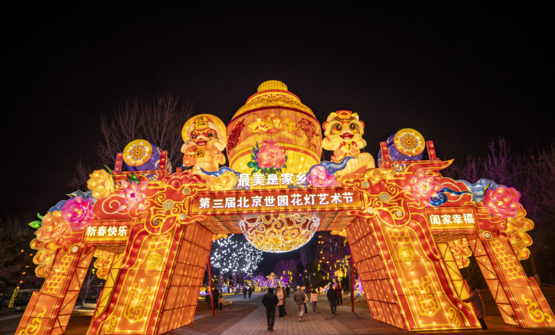 1月22日晚,第三届北京世园花灯艺术节开幕,500亩的北京世园国际旅游度假区内,汇聚上万件花灯。艺术节以“最美是家乡”为主题,中华展园汇聚31个省区市及港澳台地区特色建筑点亮家乡花灯,带领游客找寻家乡记忆。