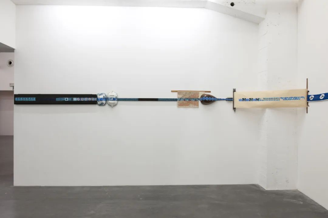 卢贝娜·希米德,《蓝色网格测试》,2020,多材料上丙烯,六频声音装置,尺寸可变。由艺术家、伦敦Hollybush Gardens画廊和纽约格林·纳夫塔利画廊提供。“Risquons-Tout”展览现场图,WIELS当代艺术中心,2020。©卢贝娜·希米德和玛格达·斯塔瓦尔斯卡。图片由布鲁塞尔WIELS当代艺术中心提供,摄影:菲利普·德·戈贝尔。