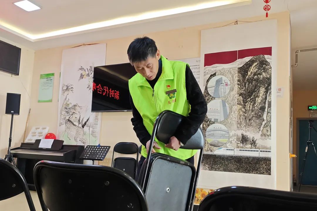 陈小兵提前摆放椅子,为活动做好准备。