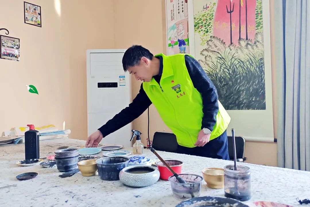 陈小兵提前为绘画班成员摆放用具。