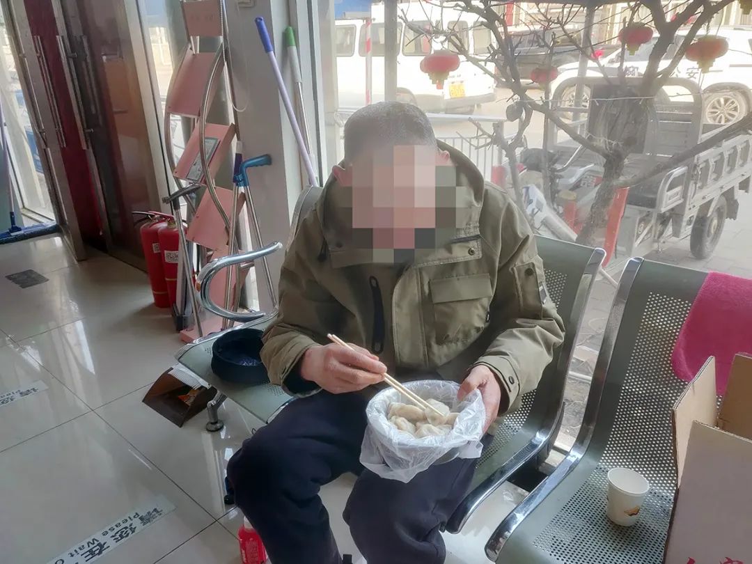 “天气这么冷,您穿得太少了,先和我们去村委会,吃点东西。”由于与老人沟通困难,郑显平无法得到其住址等相关信息,于是他将老人带到村委会。村委会工作人员为老人准备了热气腾腾的饺子。