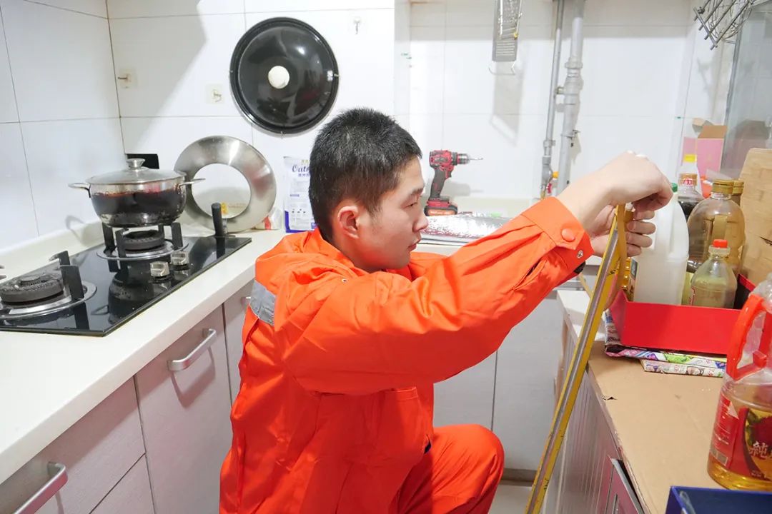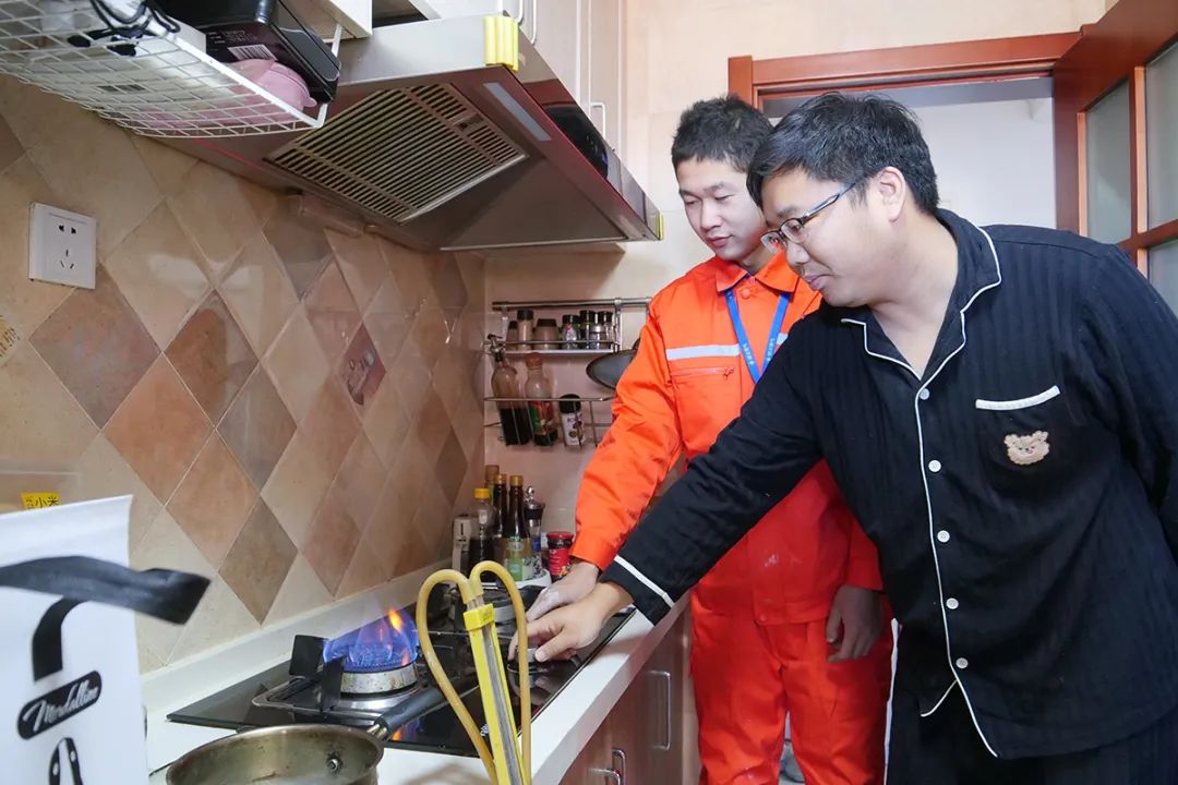 在光明街道金汉绿港一区居民李浩飞家中,工作人员按照环境检查、压力检测等作业流程,首先将厨房开窗通风,随后进行配件安装工作,整个加装过程安全有序。在安装完毕并试压合格后,工作人员用专业设备检查有无漏气情况,并向居民普及安全型配件使用方法和安全用气常识,增强居民安全防范意识。