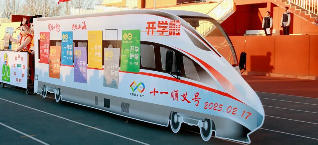 “叮!发车啦!欢迎乘坐‘十一顺义号时光动车’”,在北京市十一学校顺义学校2024至2025学年第二学期开学典礼上,一列别出心裁的时光动车缓缓驶入会场。