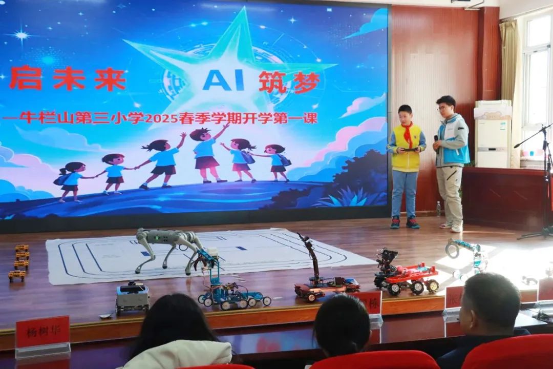 在牛栏山第三小学以“智启未来 AI筑梦”为主题的开学典礼中,全校师生开启了一段奇妙的科技探索之旅。机器狗跳舞、无人驾驶展演引得在场同学连连惊叹。这是传感技术、运动算法等前沿科技对生活产生的改变,让同学们真切地感受到了科技的无穷魅力。紧接着,一场《人工智能如何改变未来生活》的专家讲座,深入浅出地介绍了人工智能在各个领域的应用,同学们沉浸在人工智能的奇妙世界里,对未来科技充满无限憧憬。
