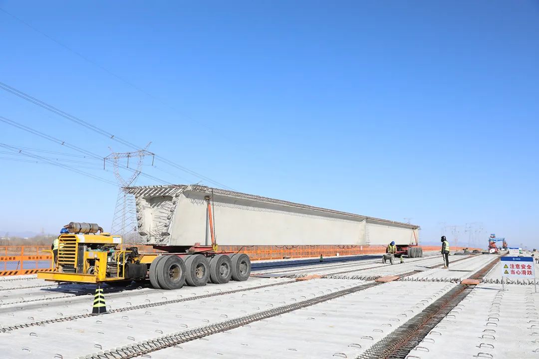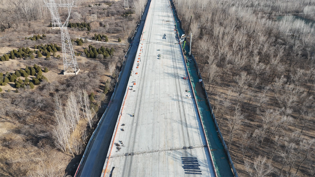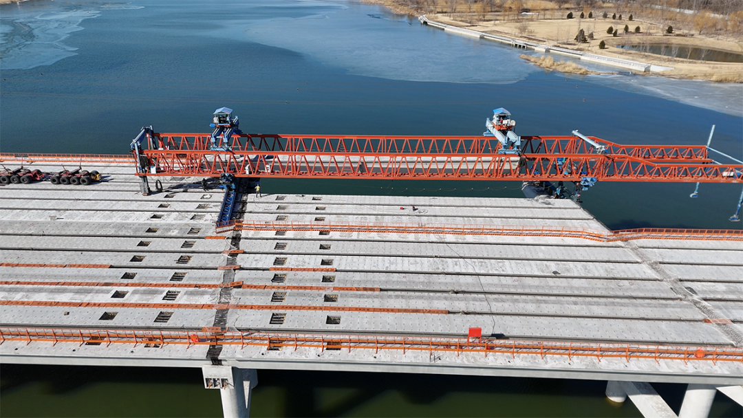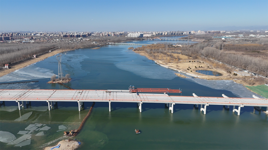 潮白河上,一座新建的大桥雏形初现。运梁车将箱梁运送至桥面上,工人们正忙着进行钢筋绑扎和焊接作业。作为通怀路二期(顺义段)工程的关键控制性节点,潮白河特大桥正在进行路基、路面、桥梁施工。