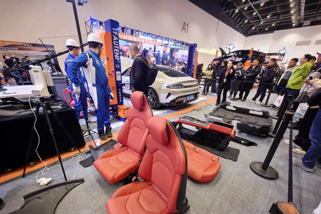 记者在现场看到,场馆内热闹非凡,各展位上琳琅满目的汽车用品整齐排列,吸引众多观众驻足了解。其中,A1馆举行的官方拆车活动是本届展会的亮点之一。技术专家现场拆解小米SU7、特斯拉、比亚迪等热销新能源车型,深度解析电池安全、电控系统及智能化架构。