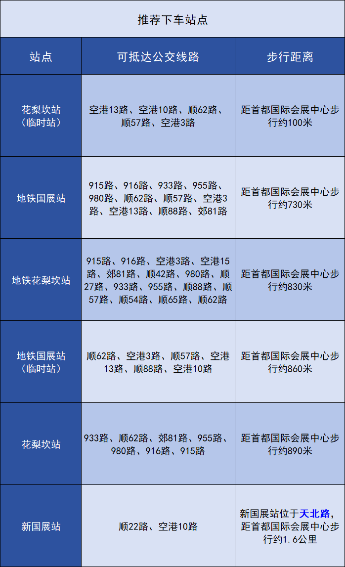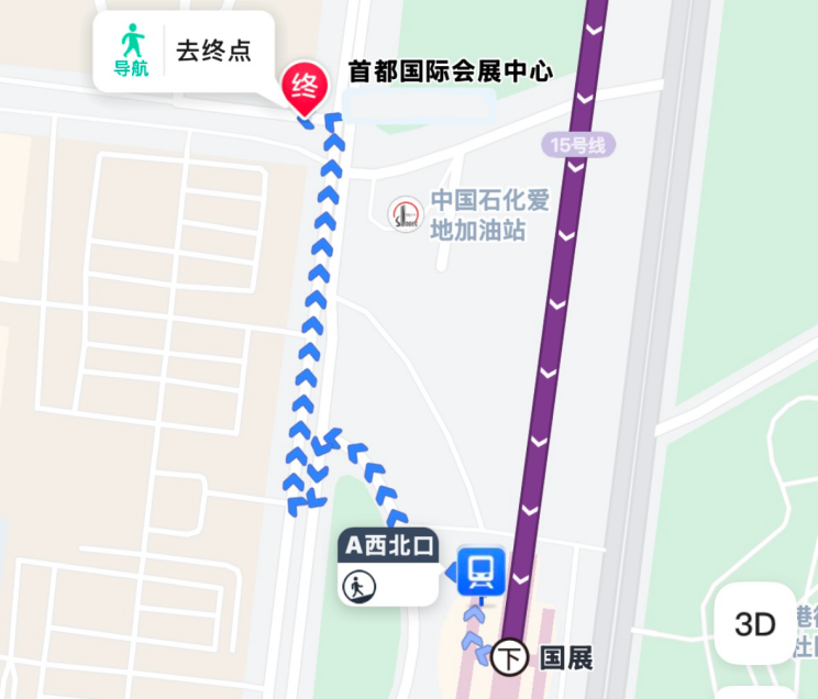 在地铁国展站下车的市民,建议从A西北口出站,步行约750米抵达首都国际会展中心东登录厅。